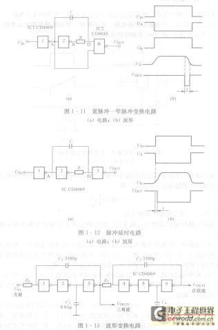 六非门组成的两个积分器,它能将方波信号变为三角波和正弦波输出。非门1、2、3组成第一级,非闩4、5、6组成第二级积分电路,电路中的Ri、R2可以根据频率及幅值的要求加以调整,C3、C4则是用来防止产生不必要的振荡。