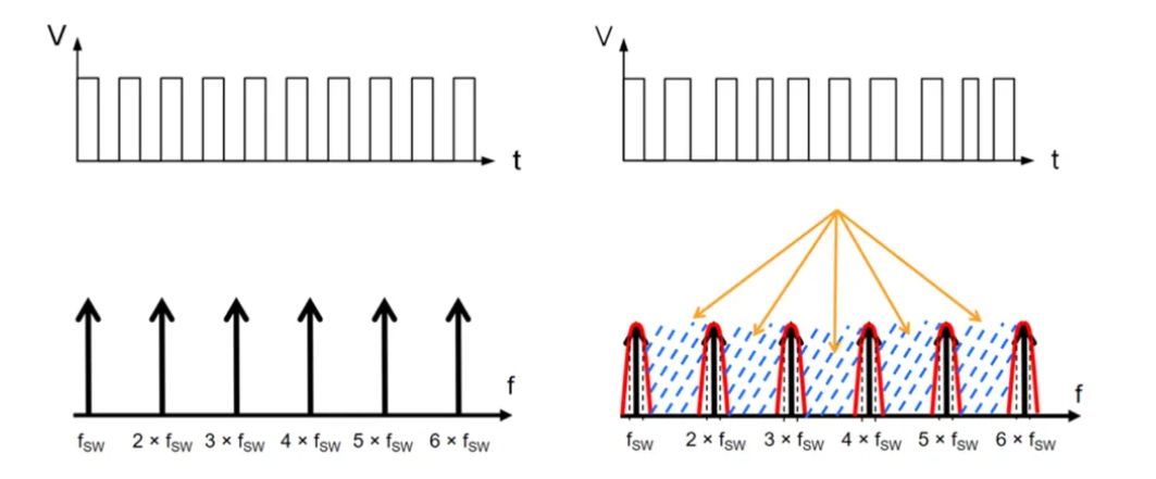 频谱扩展技术的有效性长期以来遭受了一些质疑,因为它只是降低了 EMI 频谱的峰值以满足 EMI 标准,而不是降低总噪声能量。尽管如此,这项技术仍被广泛采用,其功能可以通过频域和时域来说明[1]: