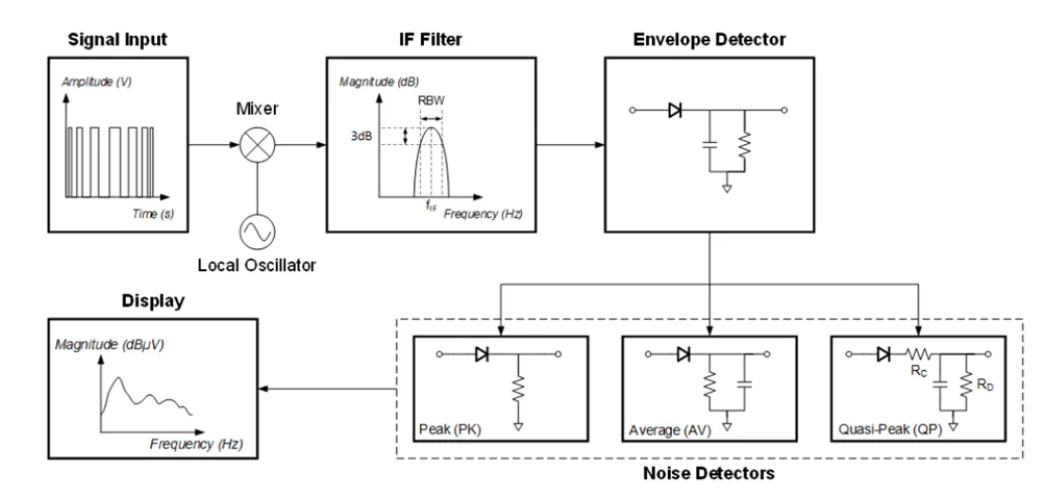 EMI 接收器可通过混频器和本地振荡器(LO)将输入信号转换为中频。由于 LO 频率可调,因此可通过改变 LO 频率将整个输入频率范围转换为恒定中频,并使用 IF 滤波器来提取目标频率周围的分量。