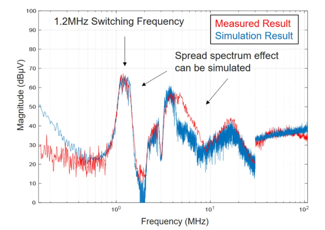基于上述流程可知,使用仿真工具模拟 EMI 接收器是可行的。图 7 比较了测量的 EMI 频谱与基于升降压 LED 驱动器MPQ7200-AEC1得到的仿真频谱。结果表明,仿真频谱扩展效应与测量结果相符。