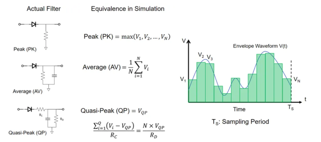 噪声检测器是 EMI 接收器的最后一级。图 6 中的 EMI 接收器显示了各种 EMI 标准(如 CISPR 标准)均要求的峰值、平均值或准峰值(QP)。不同的 EMI 测量标准依赖于特定的模拟滤波器特性,而这些滤波器的行为都可以在仿真工具中进行建模。
