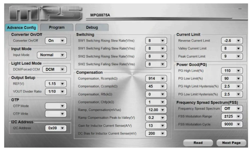 MPS 很多产品都提供可配置参数的数字接口。图 8 显示了集成型升降压变换器MPQ8875A-AEC1的配置表示例。其中,FSS 可启用或禁用, fM和 span 也可调整,可通过数字方式对性能进行评估。