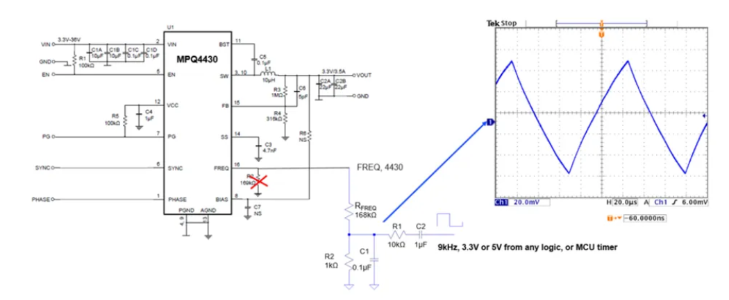 对于不提供数字接口的产品,可以使用模拟引脚来设置 fSW。可以设计一个外部电路,让 fSW遵循三角波形,其中 fM和 span 由 R、C 值确定。图 9 显示了降压开关稳压器MPQ4430用于配置 fSW 的外部电路。