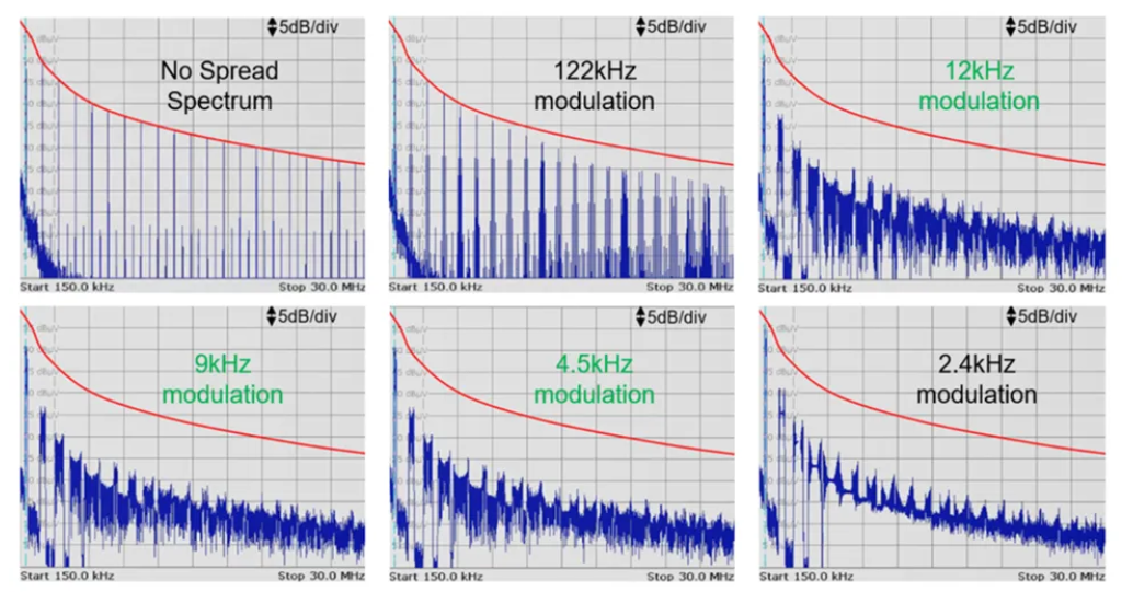 ■ 频域:EMI 易感电路仅对少数频率范围敏感,FSS 技术可降低这些频率范围的功率密度。