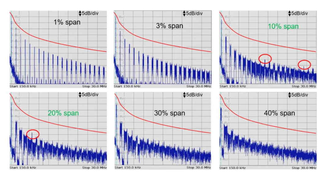 虽然幅度越大 EMI 性能越好,但幅度超过 20% 并不能带来显著改善。事实上,较大的 FSS 幅度还会影响变换器的稳定性,并与 AM 波段(530kHz 至 2MHz)等敏感波段重叠。因此,通常选择 10% 至 20% 幅度。