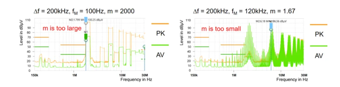 对 2MHz 方波进行不同的频率扩展调制,利用信号发生器生成 EMI 频谱,并通过 EMI 接收器进行分析。如果调制指数非常大,则意味着在 EMI 接收器捕获 RBW 相关数据期间 fSW 几乎保持不变,所以频率扩展的效果基本不可见;相反,如果 调制指数很小,则 fSW 只有几次跳变;能量都集中在这几次跳变上,无法均匀分布在整个频段上。