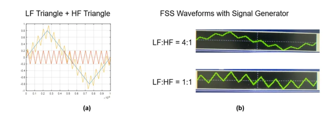 图 15:双调制 FSS 的调制波形(a)以及信号发生器应用不同比率的调制波形(b)