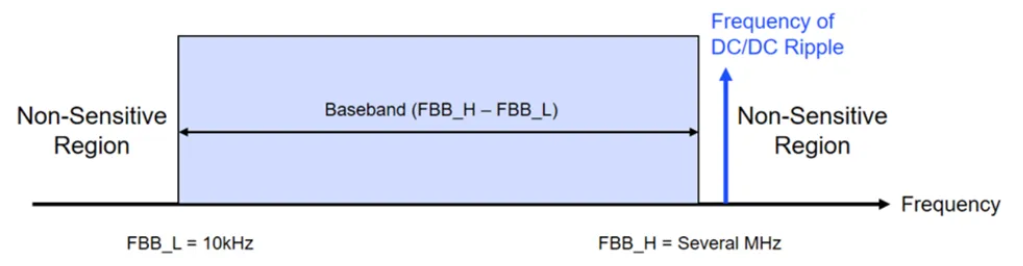 某些应用有自己的敏感频带,如雷达传感器和 D 类音频放大器。采用 FSS 技术不应在这些频带上引起额外的噪声。例如,雷达传感器的 RF 轨对基带(10kHz 至几兆 Hz)中的电源纹波和噪声很敏感,因为这些电源为锁相环(PLL)电路、基带模数转换器(ADC)和合成器等模块供电(见图 16)。