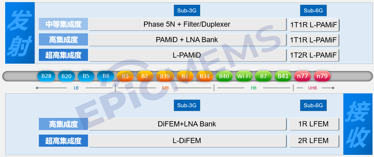 5G新增频段的滤波器主要采用常见的IPD或者LTCC技术,资源较为丰富,产品形态在发射端和接收端分别以L-PAMiF和LFEM为主。而大量使用的4G/5G接收模组,需要同时集成8~18颗SAW滤波器和SOI开关器件,并在载波聚合(CA)和多输入多输出(MIMO)方面有较高指标要求,目前国产化率低于5%。4G/5G接收模组分为两种方案:高集成度方案,使用DiFEM+LNA Bank;超高集成度方案,使用L-DiFEM单颗芯片。开元通信在2021年3月发布了第一代DiFEM和L-DiFEM接收模组产品,取得了一些市场突破;近日推出的第二代产品,在技术指标、集成度、产品可靠度等方面,达到了国际先进水平。