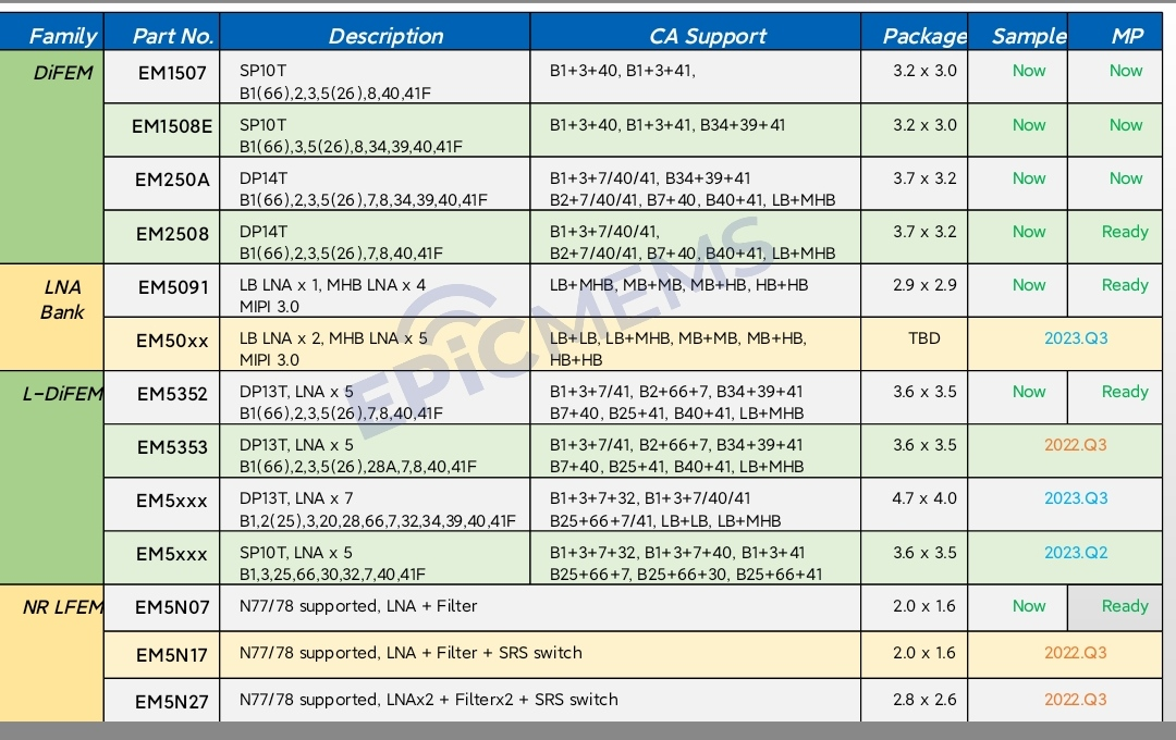 开元通信“蜂鸟Sili-SAW™”第二代接收模组产品,以高性能DiFEM和L-DiFEM为核心,根据客户端的具体频段配置,形成了丰富的产品选择。同时,3GHz以下频段的LNA Bank和3GHz以上的接收模组LFEM产品也同步量产,形成了完整的、有竞争力的5G终端接收模组解决方案。