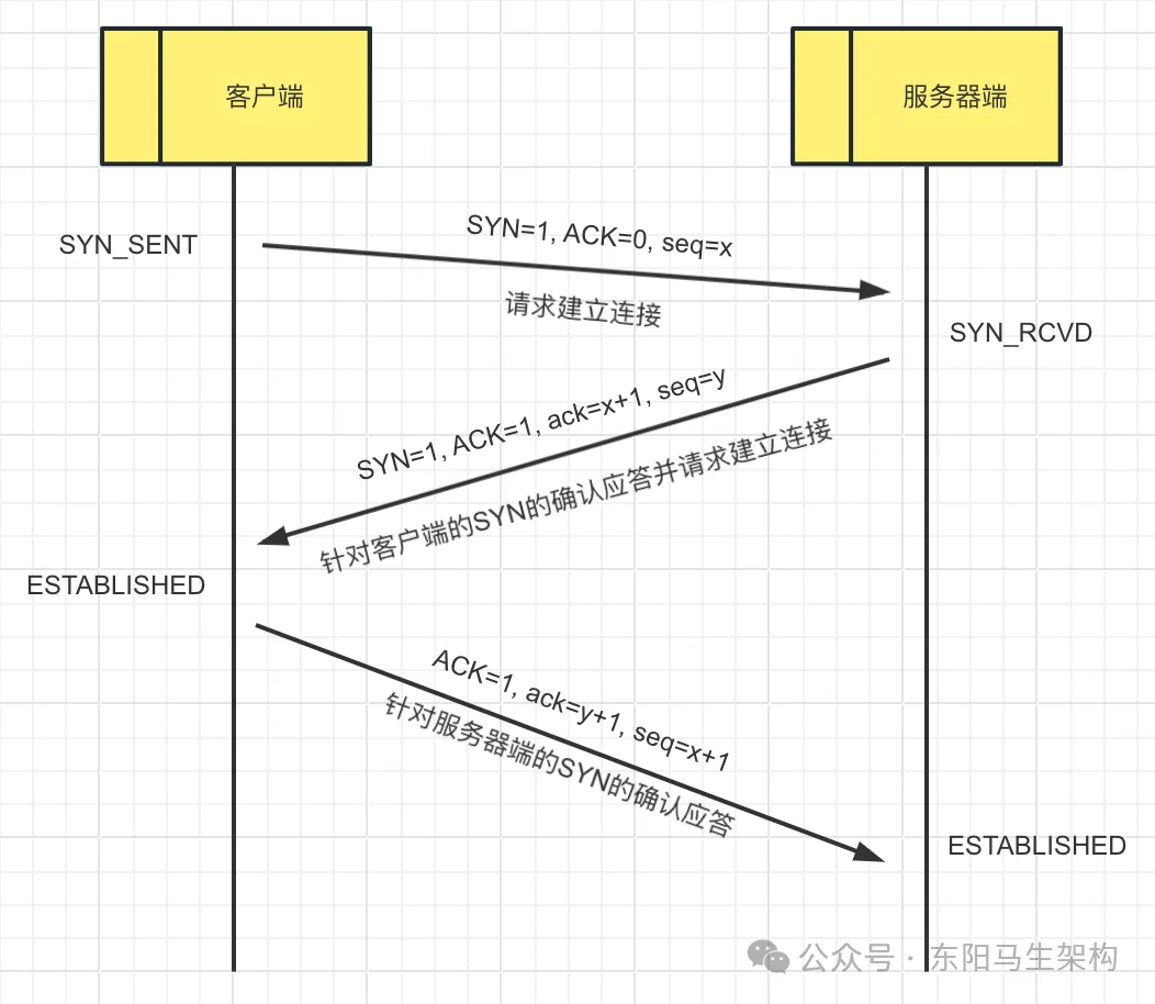 首先客户端将标志位SYN设置为1,并随机产生一个值seq=x。然后将SYN=1,ACK=0,seq=x封装成数据包发送给服务器端,发起连接请求。接着客户端进入SYN_SENT状态,等待服务器端确认。
