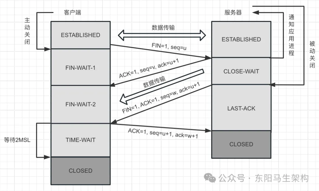 服务器收到断开连接的报文,发出确认报文。在确认报文中,ACK=1,ack=u+1,序列号seq=v。此时服务端就进入了CLOSE-WAIT(关闭等待)状态。这时处于半关闭状态,即客户端已没有数据要发送了。但如果服务器若发送数据给客户端,客户端依然需要接受。这个状态还要持续一段时间,也就是整个CLOSE-WAIT状态持续的时间。