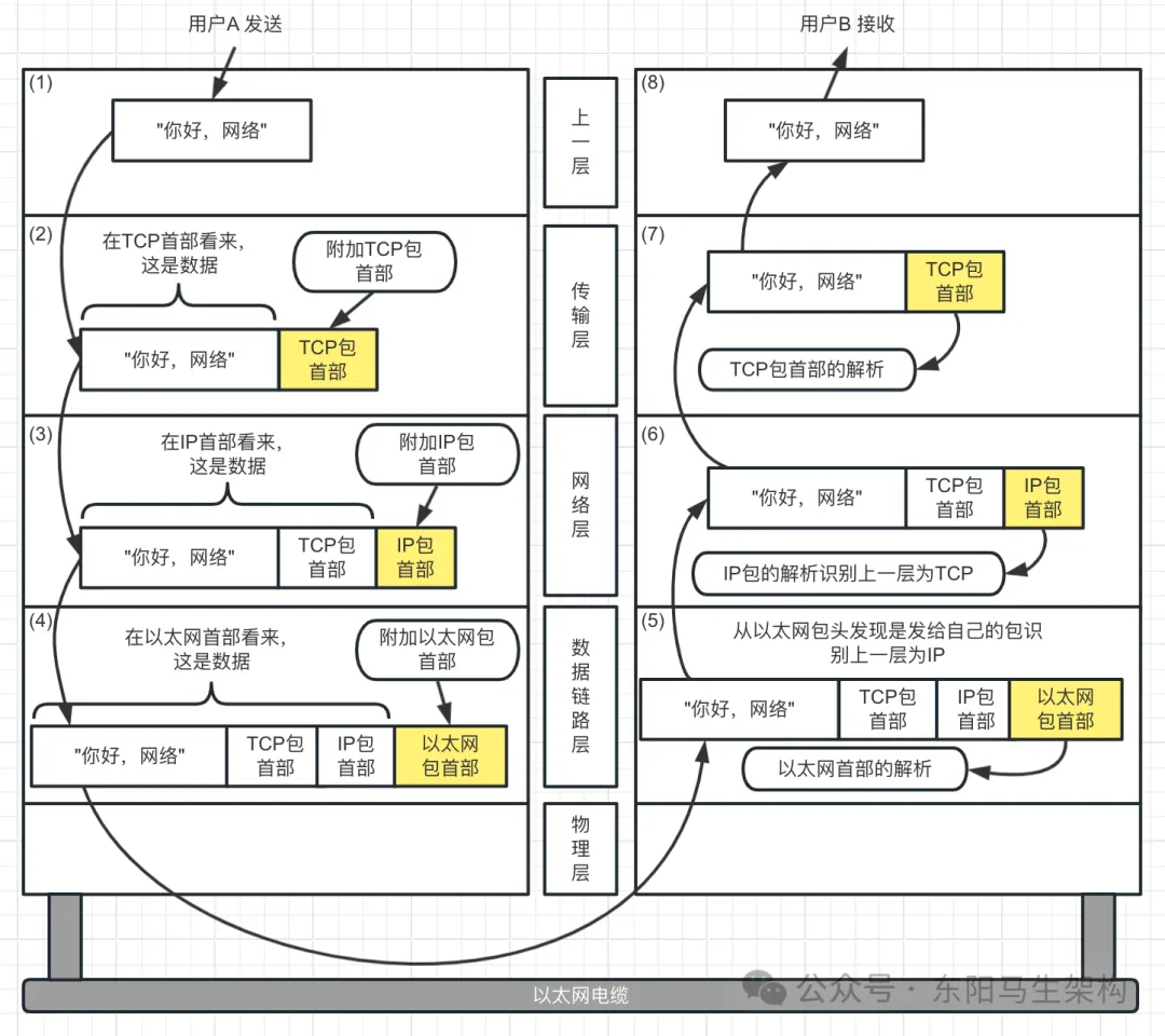 从IP传过来的IP包对于以太网来说就是数据,给这些数据附加上以太网首部并进行发送处理,生成的以太网数据包将通过物理层传输给接收端。