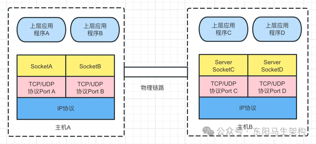 主机A的应用程序要能和主机B的应用程序通信,必须通过Socket建立连接。而建立Socket连接必须需要底层TCP/IP协议来建立TCP连接,建立TCP连接需要底层IP协议来寻址网络中的主机。