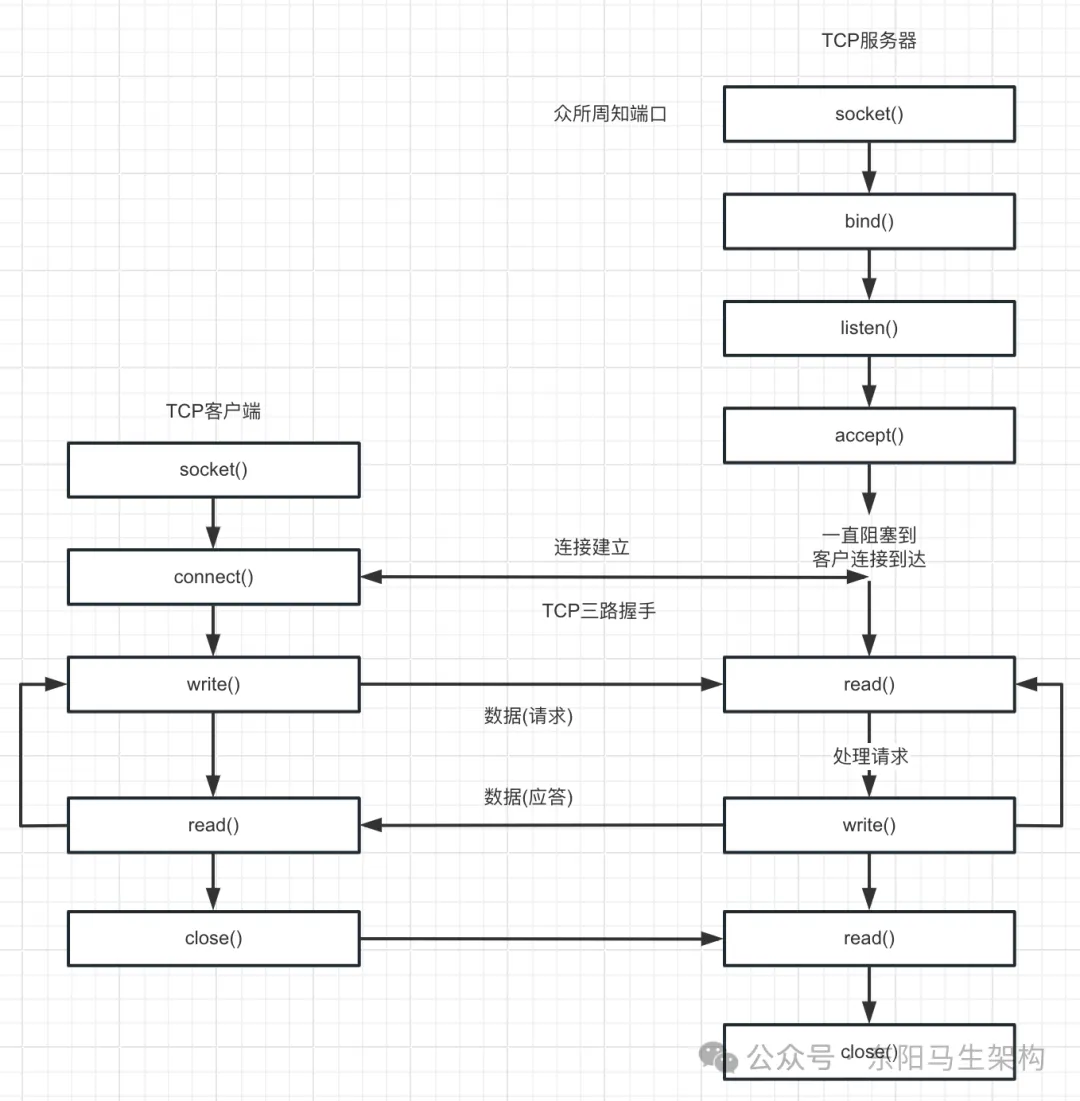 客户端和服务端都从调用socket()方法开始,它会返回一个套接字描述符。随后客户端调用connect()方法,服务端则调用bind()、listen()和accept()。客户端和服务端的数据交互则通过调用read()和write()方法来实现。关闭连接时,则通过调用close()方法来实现。