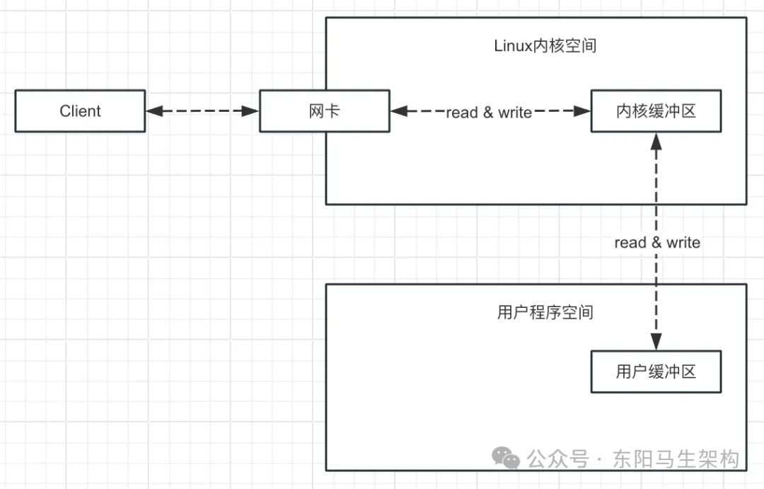 用户线程获得了目标连接后,会发起read系统调用,此时用户线程被阻塞。然后内核开始将数据从内核缓冲区复制到用户缓冲区,接着内核返回结果。