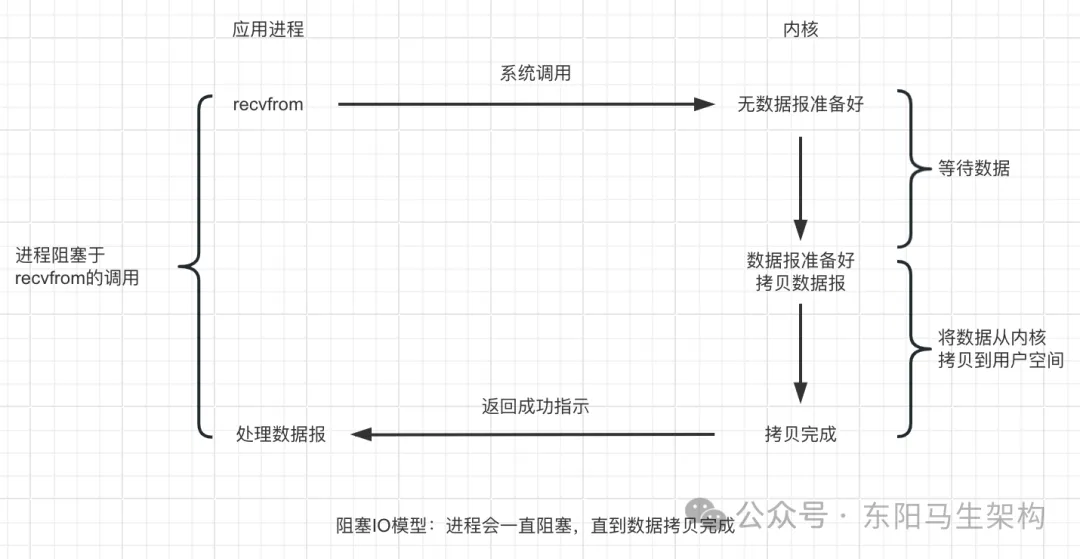 应用程序调用一个IO方法,导致应用程序阻塞,等待数据准备好。如果数据没有准备好,则一直等待。如果数据准备好,则将数据从内核空间拷贝到用户空间,然后返回是否成功。