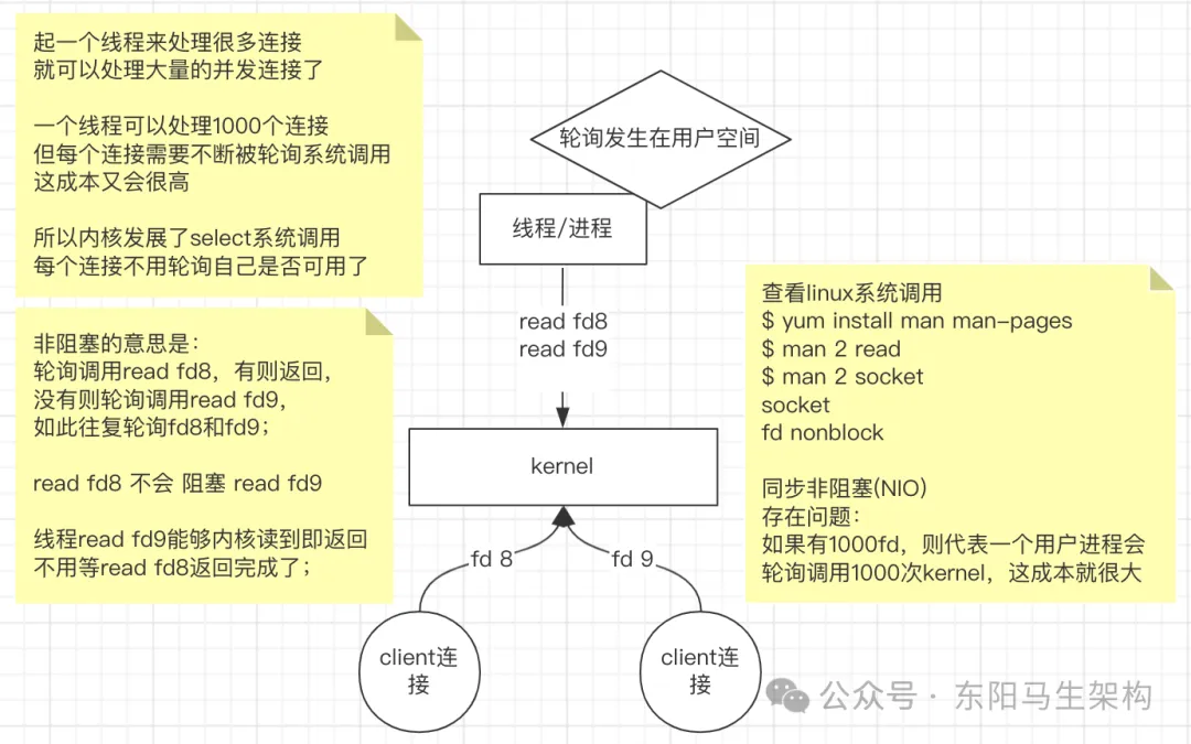 需要不断重复发起IO系统调用,不断询问内核。这种不断的轮询将会占用大量的CPU时间,系统资源利用率比较低。